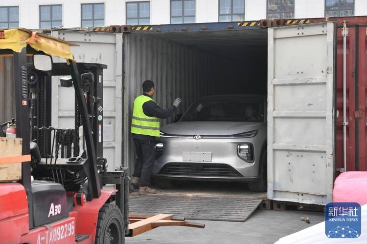 ↑11月14日,在西安国际港站哈萨克斯坦西安码头,工人将新能源汽车驶入集装箱内。新华社记者 邵瑞 摄