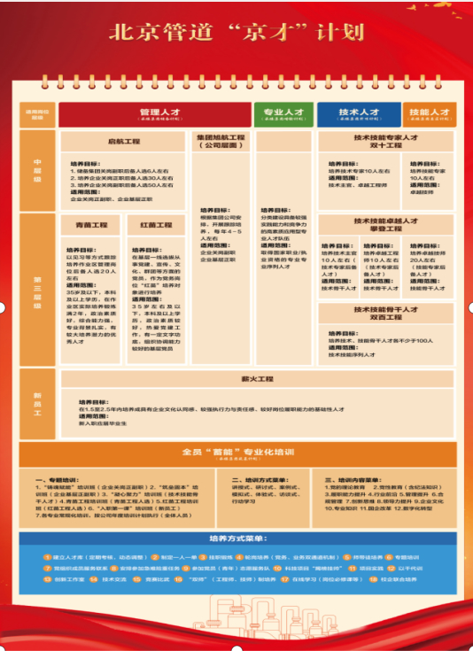 人才作为新质生产力的核心驱动要素,其培育成长与企业发展已形成深度共生关系:一方面,人才资源通过知识创新、技术突破和管理升级等方式直接推动新质生产力跃升;另一方面,企业高质量发展搭建的多元平台,又为人才持续成长提供了实践沃土和上升通道。北京管道公司有效承接集团人才强企“五大计划”,大力推进实施“京才”计划,构建人才全链条培养体系。